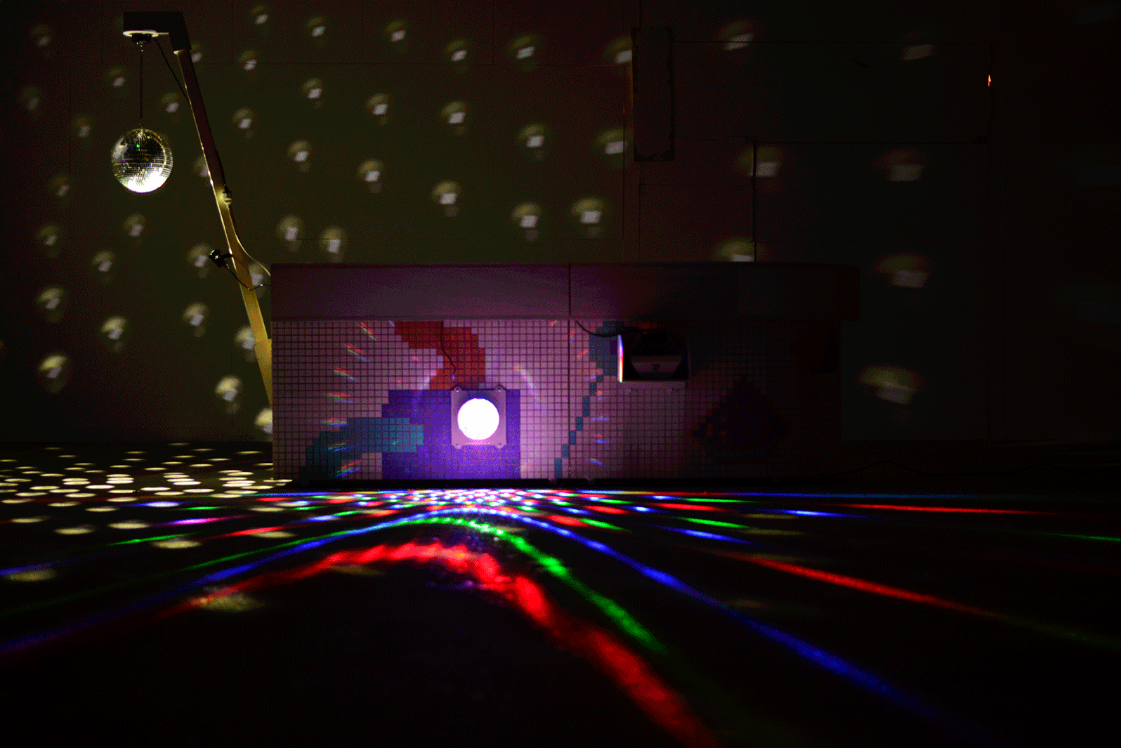Bien qu'il soit un simple comptoir de bar la journée, le Discobar montre son vrai visage qu'à la nuit tombée. Branché au secteur, sa boule à facette et son dôme de diamants se mettent à tournoyer au rythme des bulles soufflées par une machine, transformant l'espace en véritable piste de danse. Le meuble disparaît alors derrière une façade de lumière en mouvement pour faire place à la fête.
