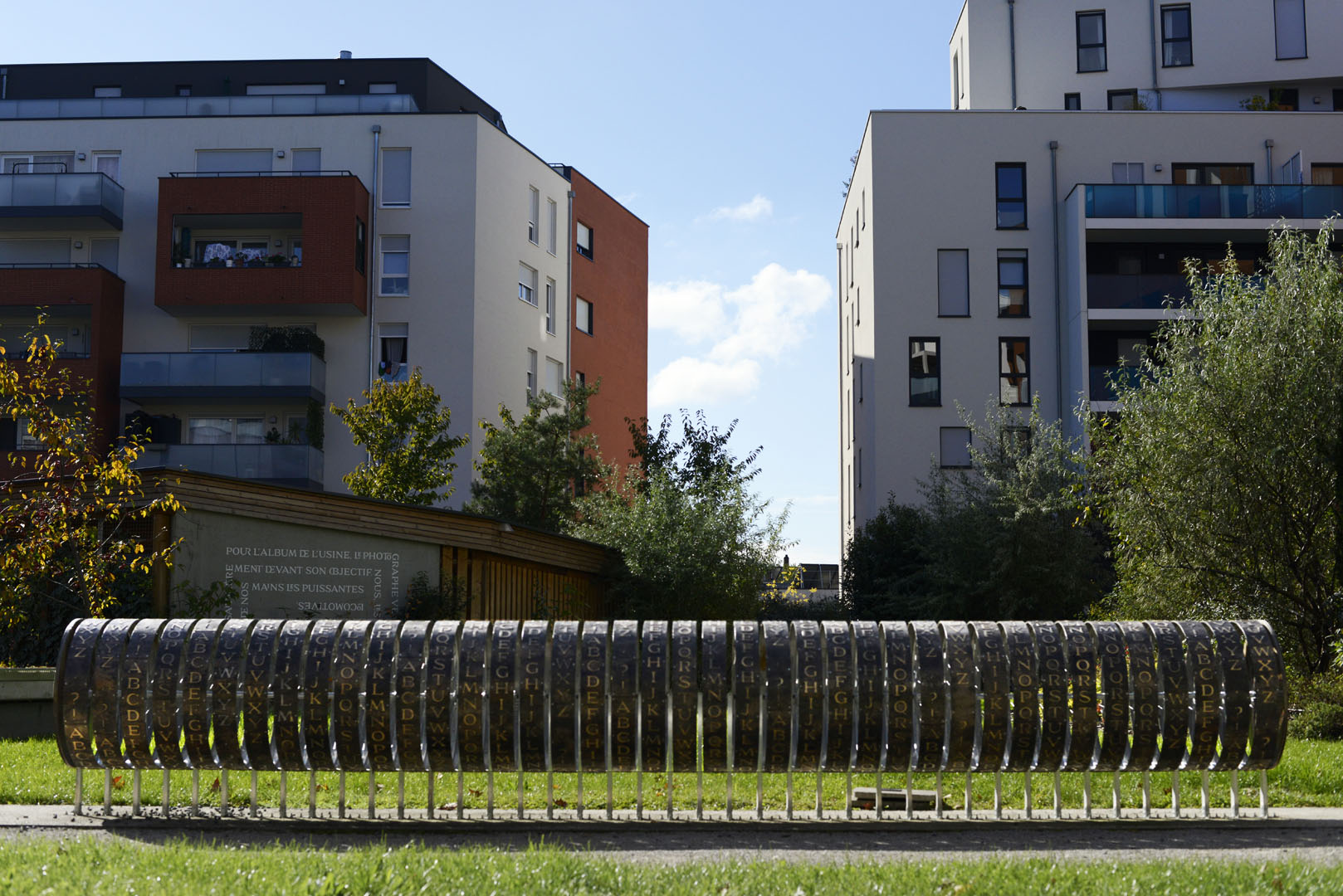 C'est un cylindre composé de 40 disques rotatifs en bois, offrant le minimum de lettres pour constituer une phrase. Sur chaque disque est inscrit un alphabet entier et une ponctuation basique. Il est conçu pour prendre place à l'extérieur et être manipulé régulièrement. Ces contraintes ont demandé une réflexion en conséquence quant à la pérennité de l'installation et ont, pour ma part, fait de ce projet un véritable défi.